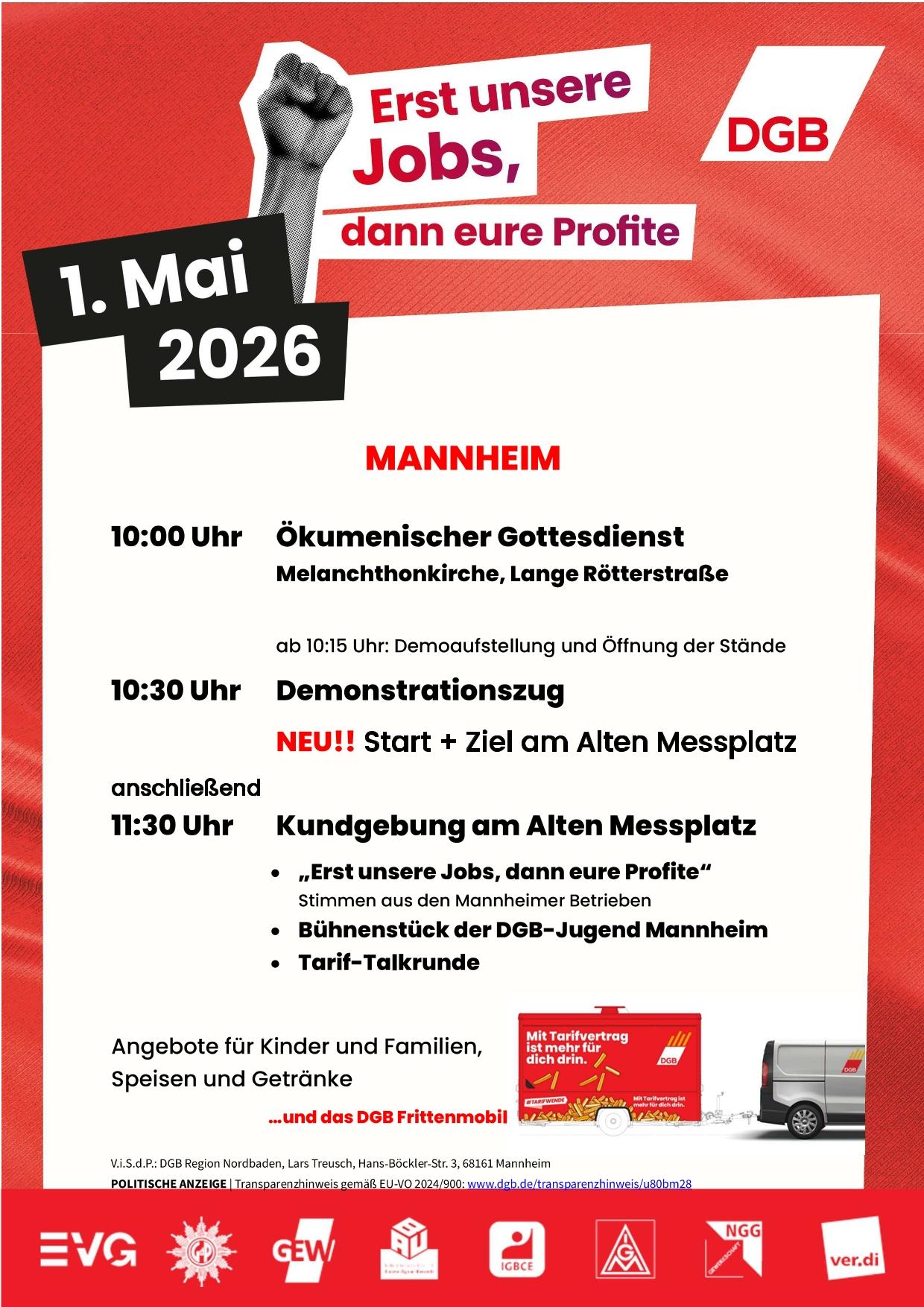 Erst unsere Jobs, dann eure Profite“ – unter diesem Motto rufen die Gewerkschaften in diesem Jahr zum 1. Mai auf. Am Tag der Arbeit demonstrieren wir gemeinsam für eine gerechte Arbeitswelt und ein gutes Leben.