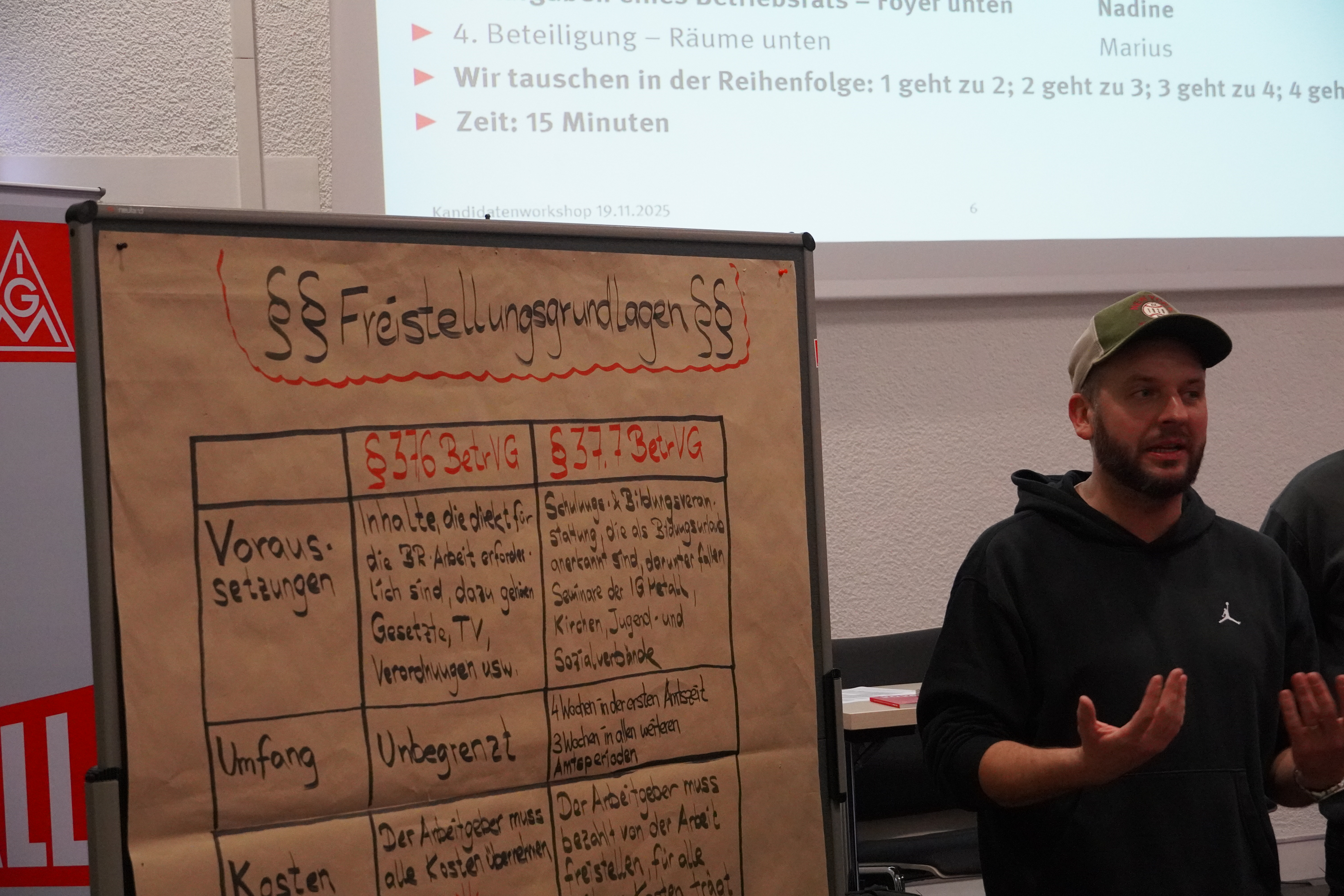 Michael stellt das Bildungsangebot der IG Metall und der Bildungskooperation in Baden e.V vor. Er zeigt den Teilnehmenden, dass sie auf ein umfangreiches Qualifikationsangebot zugreifen können. „Betriebsräte fallen nicht fertig gebacken vom Himmel! Man muss den Umgang mit dem Gesetz lernen und Erfahrungen sammeln. Dabei unterstützen wir euch!“