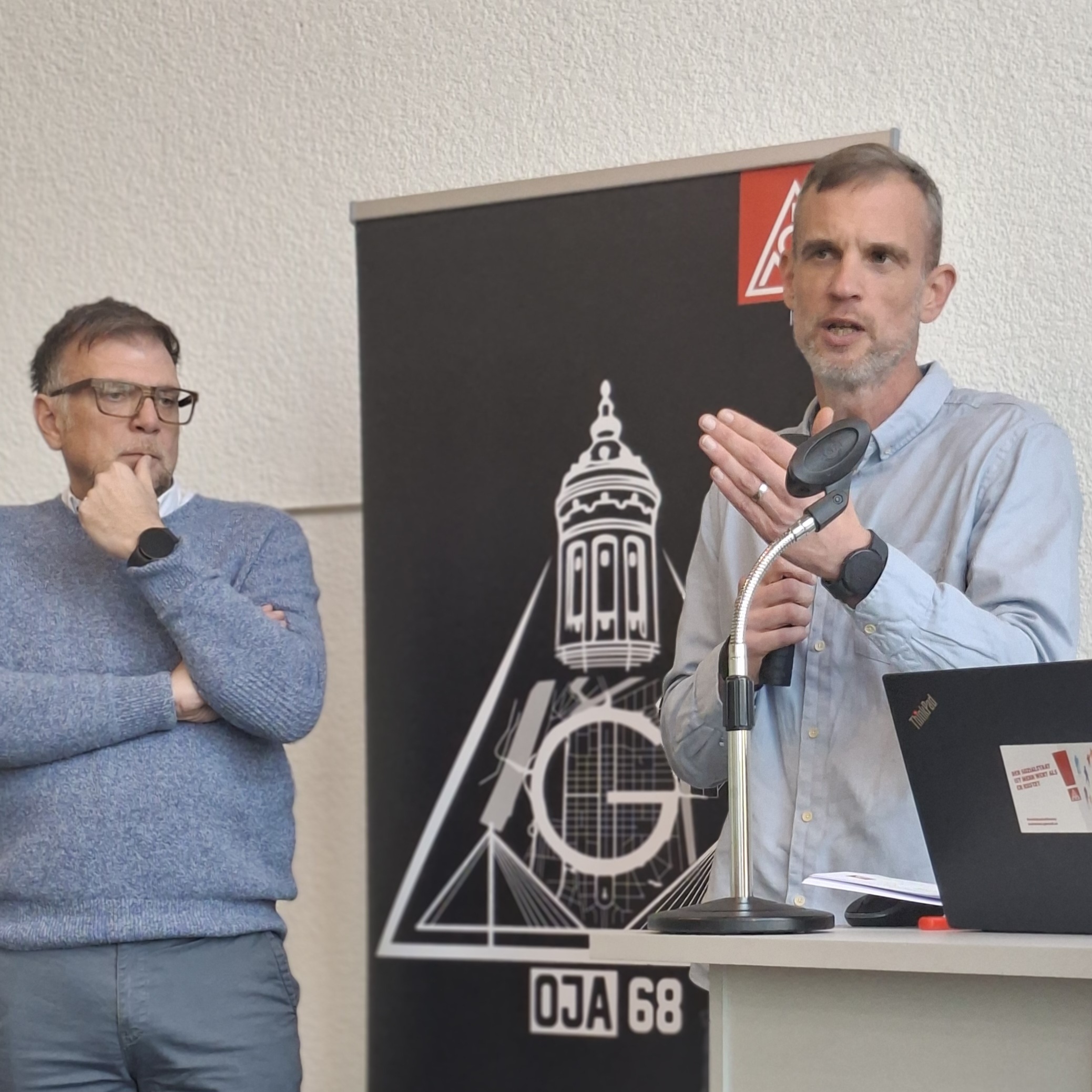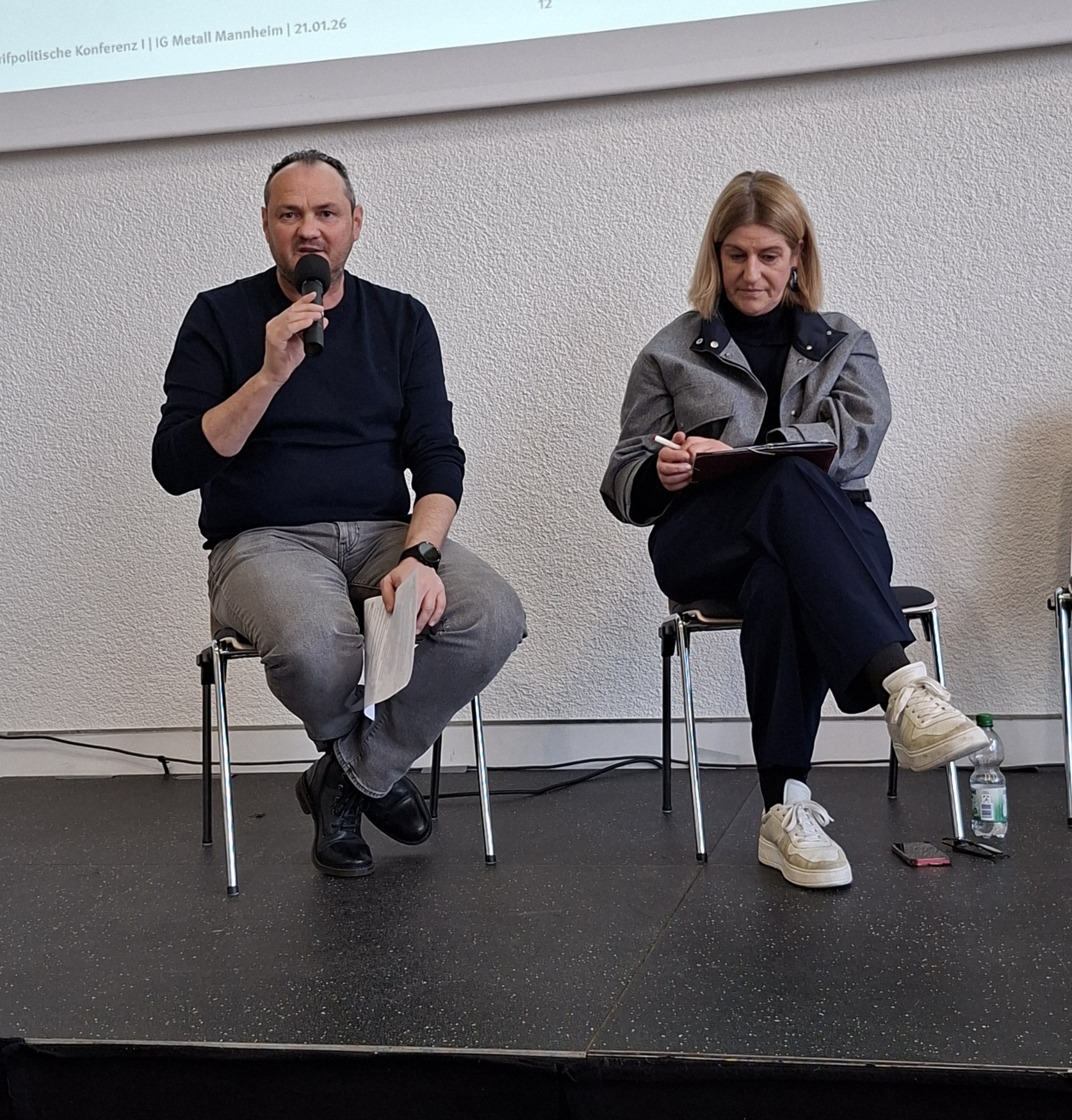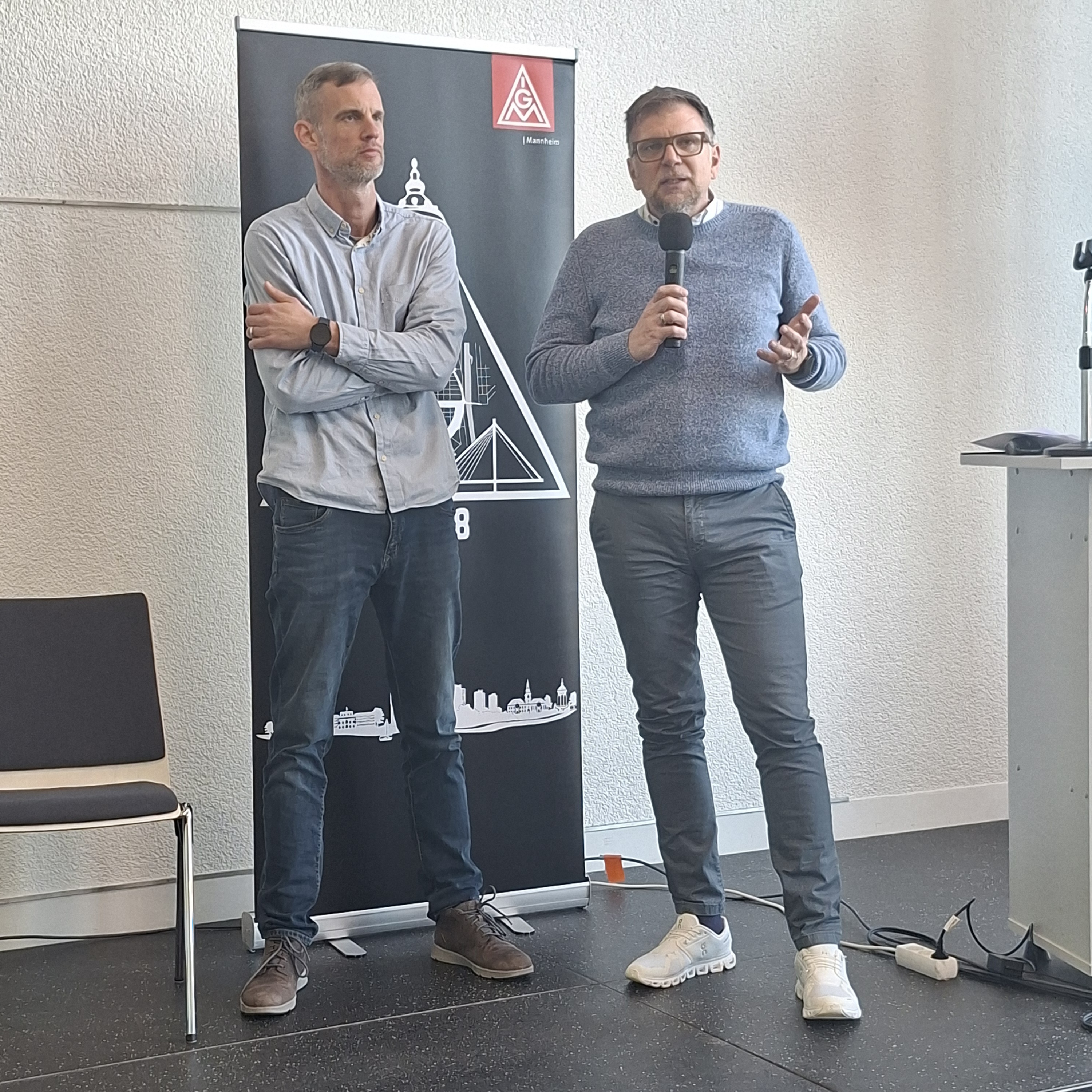 Thomas Hahl, 1. Bevollmächtigter und Geschäftsführer, und Daniel Warkocz, 2. Bevollmächtigter und Geschäftsführer, riefen die Themen aus dem Debattenpapier der IG Metall Mannheim in Erinnerung, das 2025 erstellt worden war.